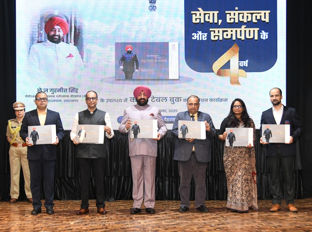 देहरादून,। राज्यपाल लेफ्टिनेंट जनरल गुरमीत सिंह (से नि) ने आज राजभवन में ‘‘सेवा, संकल्प और समर्पण के चार वर्ष’’ शीर्षक कॉफी टेबल बुक का विमोचन किया। यह कॉफी टेबल बुक, राजभवन सूचना परिसर द्वारा राज्यपाल के चार वर्षों के कार्यकाल की उपलब्धियों पर आधारित है। उल्लेखनीय है कि राज्यपाल ने 15 सितम्बर को उत्तराखण्ड के राज्यपाल के रूप में चार वर्ष पूर्ण किए हैं। यह कॉफी टेबल बुक राज्यपाल के प्रेरणादायक विचारों के साथ-साथ उनके मिशन, एआई टेक्नोलॉजी, शिक्षा, महिला सशक्तीकरण, युवाओं के मार्गदर्शन एवं अन्य सामाजिक विषयों पर केंद्रित है। कार्यक्रम में राज्यपाल के चार वर्षों के कार्यकाल पर आधारित लघु फिल्म का भी प्रदर्शन किया गया।