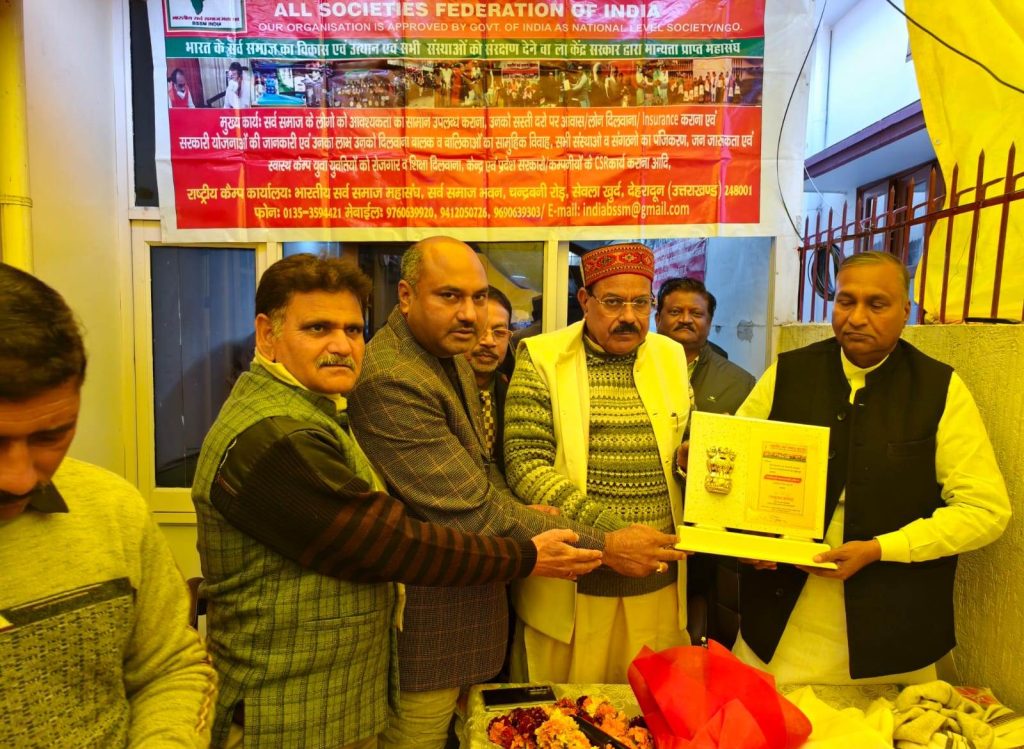 देहरादून,। भारतीय सर्व समाज महासंघ के मुख्य पदाधिकारी एवं उत्तराखंड के विभिन्न प्रदेश के अध्यक्षों की बैठक संस्था के प्रदेश कार्यालय इंदिरापुरम में आयोजित की गई, जिसकी अध्यक्षता प्रदेश अध्यक्ष इंजीनियर कृपाल सिंह एवं संचालन महामंत्री पवन शर्मा द्वारा किया गया। सभा के मुख्य अतिथि बसपा के वरिष्ठ विधायक शहजाद अहमद तथा विशिष्ट अतिथि राष्ट्रीय अध्यक्ष रामकुमार वालिया रहे। सभा में सर्वप्रथम रामकुमार वालिया को किसान उपभोक्ता सहकारी समिति लिमिटेड का राष्ट्रीय अध्यक्ष चुने जाने पर बधाइयां दी गई तथा प्रधानमंत्री एवं गृहमंत्री का आभार प्रकट किया गया प् सभा को संबोधित करते हुए विधायक शहजाद अहमद ने कहा कि रामकुमार वालिया के नेतृत्व में किसान उपभोक्ता सहकारी समिति लिमिटेड विकास की राह पर अग्रसर है प् उन्होंने कहा कि उत्तराखंड में सर्व समाज की एकता बहुत जरूरी है और उन्होंने सर्व समाज संस्था से पहाड़ी और मैदानी एकता पर बल दिया प् उन्होंने कहा कि मेरा पूरा समर्थन सदैव सर्व समाज के साथ रहेगा। संस्था के अध्यक्ष रामकुमार वालिया ने बताया कि आज संस्था के पूरे देश में 5 लाख और उत्तराखंड में 25 हजार से अधिक सदस्य हैं। रामकुमार वालिया ने बताया निष्क्रिय लोगों को पद से मुक्त करते हुए नई कार्यकारिणी गठित की जा रही है। कार्यक्रम में मुख्य रूप से जन अधिकार पार्टी के राष्ट्रीय अध्यक्ष आजाद अली पूर्व राज्य मंत्री एवं ईसाई समाज के प्रदेश अध्यक्ष फादर एम दयाल, कश्यप समाज के प्रदेश अध्यक्ष राम सिंह कश्यप, सैनी समाज के नेता करम सिंह सैनी, कायस्थ समाज के प्रदेश अध्यक्ष अनिल श्रीवास्तव, त्यागी समाज के उपाध्यक्ष अनिल त्यागी, जाट समाज से चौधरी अशोक मलिक, ब्राह्मण समाज के सुबोध शर्मा, सुधा शर्मा, नीरज कौशिक, लोधी समाज से अशोक कुमार प्रमुख रूप से उपस्थित रहे प् राम कुमार वालिया ने कहा कि भारतीय सर्व समाज महासंघ भारत सरकार से मान्यता प्राप्त संस्था है और राष्ट्रीय स्तरीय महा संस्था तथा एनजीओ है, जिसका मुख्य कार्य भारत के सर्व समाज का विकास एवं उत्थान करना है प् संस्था के पूरे देश में 5 लाख से ज्यादा सदस्य और अकेले उत्तराखंड में 25,000 सदस्य हैं। रामकुमार वालिया ने यह भी कहा कि संस्था की उत्तराखंड प्रदेश इकाई में कुछ पदाधिकारी की नियुक्तियां की जाती है, जो अवैतनिक रूप से कार्य करेंगे तथा इनकी कार्य अवधि 27 जनवरी 2026 से 27 जनवरी 2028 तक रहेगी। सभी नियुक्तियां तत्काल प्रभाव से लागू रहेगी। इंजीनियर कृपाल सिंह प्रदेश अध्यक्ष, अनिल कुमार श्रीवास्तव प्रदेश कार्यकारी अध्यक्ष, प्रमोद कुमार गुप्ता प्रदेश कार्यकारी अध्यक्ष, डीएस नेगी प्रदेश महामंत्री, मनोज चौहान प्रदेश महामंत्री, पवन शर्मा प्रदेश महामंत्री,अनि