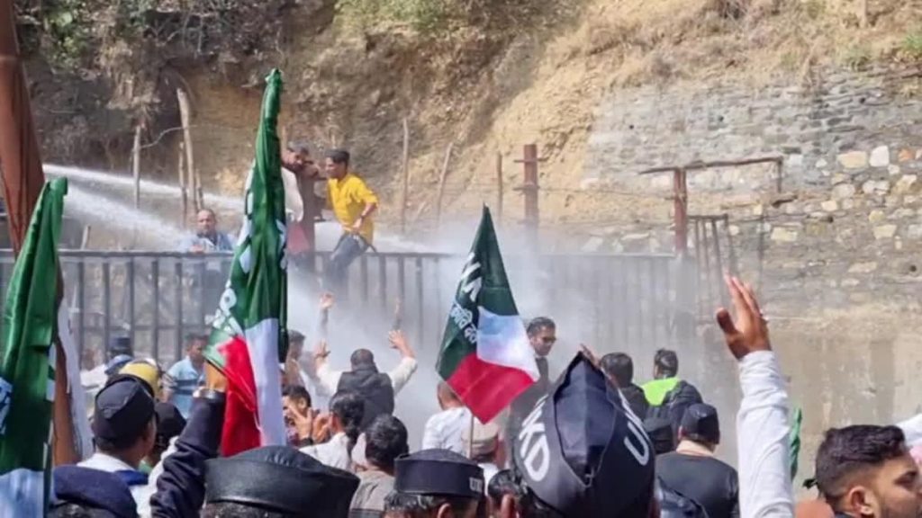 गैरसैंण,। उत्तराखंड की ग्रीष्मकालीन राजधानी गैरसैंण के भराड़ीसैंण विधानसभा भवन के अंदर एक तरफ राज्यपाल का अभिभाषण चल रहा था, को दूसरी तरफ विधानसभा के बाहर सड़क पर हंगामा हो रहा था। उत्तराखंड क्रांति दल (यूकेडी) के सैकड़ों कार्यकर्ता जुलूस की शक्ल में विधानसभा की ओर बढ़ रहे थे। आखिर में पुलिस बल ने कार्यकर्ताओं को रोकने का प्रयास शुरू किया। प्रदर्शनकारियों को रोकने के लिए पुलिस को वाटर कैनन का भी प्रयोग करना पड़ा। इस दौरान कार्यकर्ताओं और पुलिस जवानों के बीच जमकर धक्का मुक्की हुई।