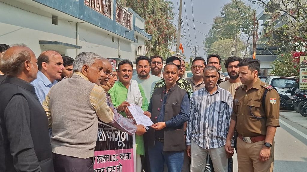 देहरादून,। एक पक्षीय यूजीसी के प्रस्तावित काले कानून/ड्राफ्ट रेगुलेशन के सामाजिक असंतुलन संबंधी गृहमंत्री भारत सरकार अमित शाह को संबोधित एक ज्ञापन उत्तराखंड ब्राह्मण समाज महासंघ द्वारा नायब तहसीलदार सदर सुरेश सेमवाल को सौंपा। जिला शासन के प्रतिनिधि नायब तहसीलदार सदर श्री सेमवाल ने ब्राह्मण प्रतिनिधिमंडल को आश्वस्त किया कि वे उनका ज्ञापन गृहमंत्री अमित शाह को प्रेषित कर देंगे।